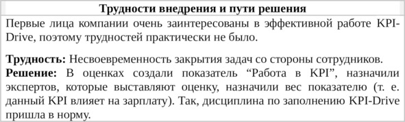 Два слова – о тех трудностях, которые у нас возникли при внедрении системы KPI-Drive (таб. 3). Во-первых, сотрудниками несвоевременно закрывались задачи. Эту проблему мы решили с помощью оценки «Работа в KPI». Через нее мы лишний раз показываем сотрудникам, насколько для нас важно использование в повседневной деятельности программы KPI-Drive. А в том случае, если они будут работать в ней без учета тех стандартов, которые в компании приняты, то их накажут.