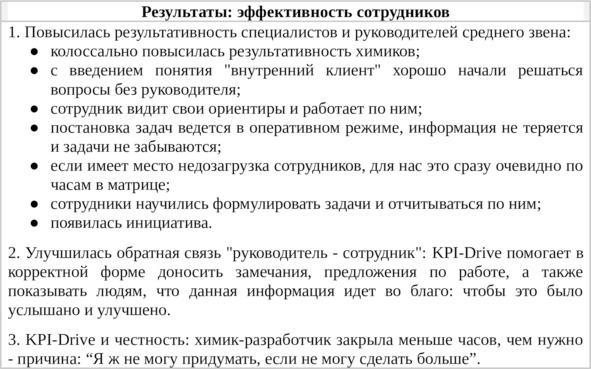 Отдельно хочу сказать о том, что в результате внедрения системы KPI-Drive повысилась результативность и эффективность сотрудников среднего звена (таб. 5). Например, наши химики-разработчики ускорили процесс выдачи новых продуктов. Мы поменяли матрицу, и тут же увидели положительный эффект.