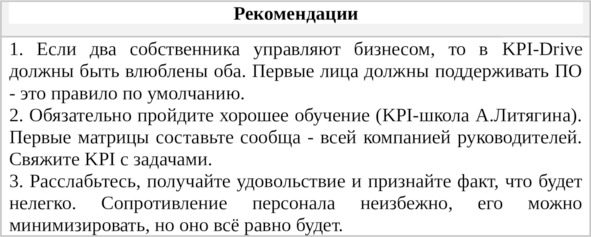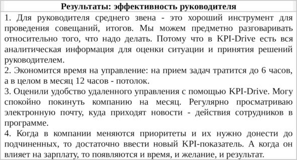 Если кто-то для себя пока не определился со способом управления результативностью персонала, то я бы все-таки рекомендовала более пристально присмотреться к программе KPI-Drive. Потому что этот программный продукт задает сотруднику направление действий. В его матрице всё сказано! Разъясняя подчиненному каждый из пунктов, например, почему поставлены такие показатели и оценки, мы задаем сотруднику некий вектор движения.
