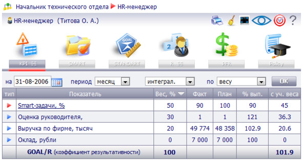 HR-служба – это вообще очень интересно. У HR основной показатель – повышение эффективности труда, но его сложно мерить. Вызвано это тем, что есть колебания сезонности. Чтобы мерить ежемесячно – для этого нужно статистику собрать, сколько было 5 лет назад, 6 лет назад, тогда в 7-ом году можно показатели забивать и ставить. Мы смотрели европейский показатель, если я ошибаюсь, вы можете меня поправить, по-моему, составляет 270 тыс. евро в год на человека. Мы брали компании европейские, которые занимаются схожей с нашей деятельностью. В Японии он составляет примерно 320 тыс. на человека – у них повыше эффективность труда. В России считается, что если 100—120 тыс., то это очень продвинутая компания. Потенциал огромный. Мы с ней сели и давай думать, как это всё мерить. Всё это стоит в голове, но мерить, к сожалению, нельзя. И вот у неё – оценка руководителя и с маленьким весом – выручка для того, чтобы эффективность какая-то проявилась. Количество сотрудников здесь есть – 94, выручка есть, статистики мало. Боюсь просто неправильно поставить план.