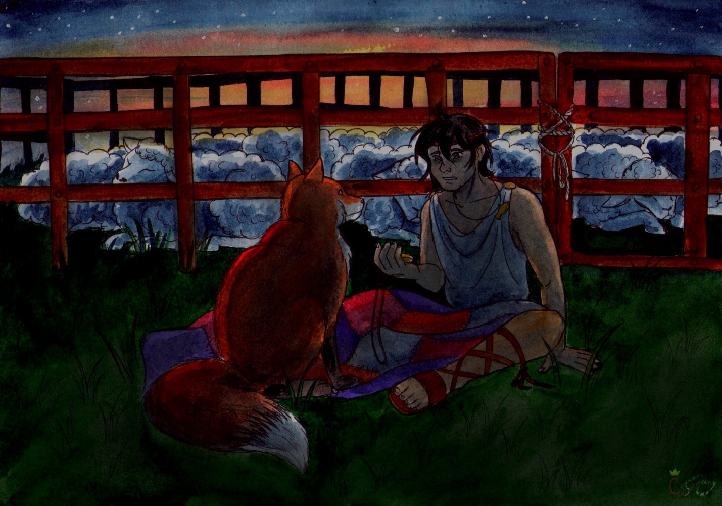 Лис, до этого сидевший в ожидании, внимательно следивший за мужчиной, ловко подцепил зубами брошенный ранее предмет и метнулся в темноту за секунду до того, как палка ударила в то место, где он раньше сидел. Лис несся в сторону горной тропы, мелькал между деревянными домами, сложенных из тонких стволов деревьев, крытых плетеными навесами и слоем толстых листьев. Лишь у начала подъёма к горному пастбищу он остановился, устало и как-то обреченно посмотрел на спящую деревню и поспешил вверх, на этот раз не оглядываясь.