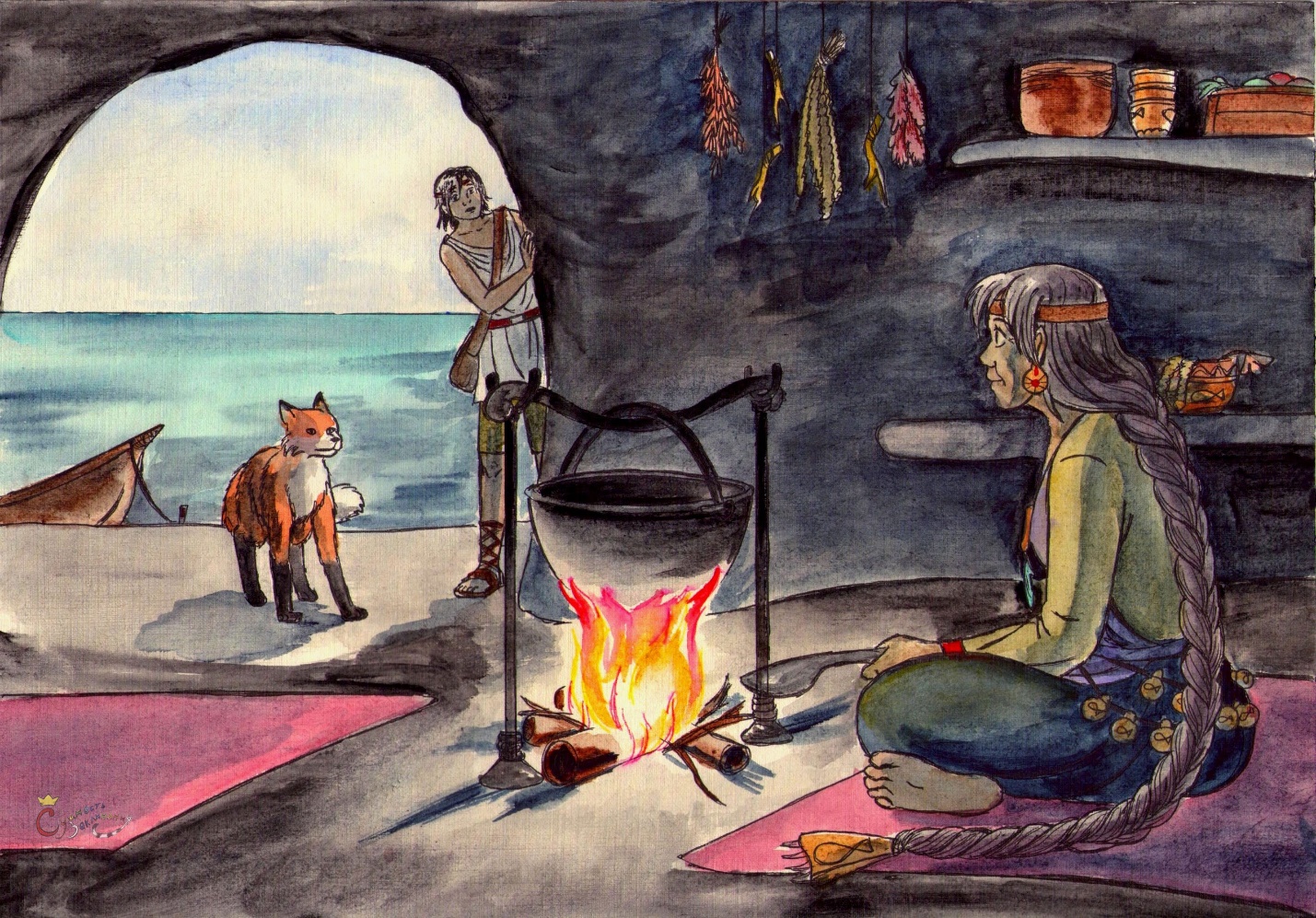 Лис тявкнул и поспешил вглубь пещеры, скрылся за очередным выступом стены. Ведьма же сняла котелок с огня и поставила на каменный стол. Затем поманила мальчика к себе и указала на каменный выступ, покрытый пестрой толстой тканью.