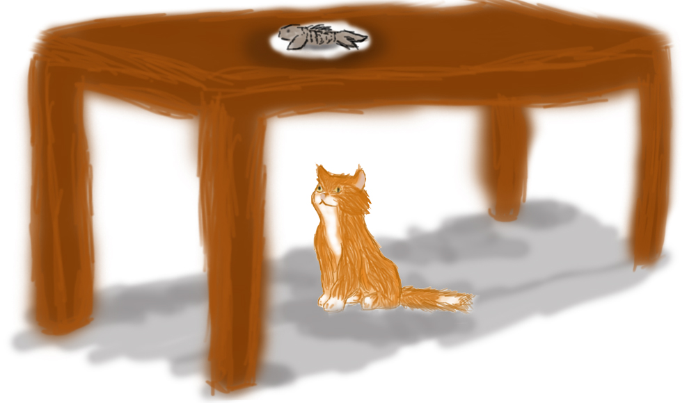 Под столом котик обидно пристроился.