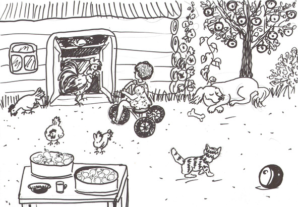 Сажусь на велик, который стоит у крыльца, он радостно поскрипывает под моими босыми ножками – его не забыли. Еду по огромному двору, в сарай. Около входа, в который, стоит единственный петух. Он очень красивый, покрыт зелеными, синими и красными перьями Искоса смотрит на меня и сожалеет, что не может доказать свою удаль и клюнуть эту хозяйкину милую дочь. В курятнике, быстро забираюсь, на третью ступеньку лесенки и нежно засовываю ручку под белую несушку. Курица тихонько начинает кудахтать, как бы обижаясь, что ее проверяют.