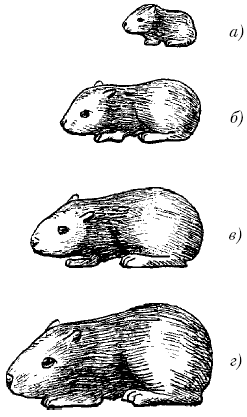 Соотношение между возрастом и размером тела зверька: а – новорожденный – 10 см; б – 5 нед – 19 см; в – 5 мес – 23 см; г – взрослая морская свинка – 27 см