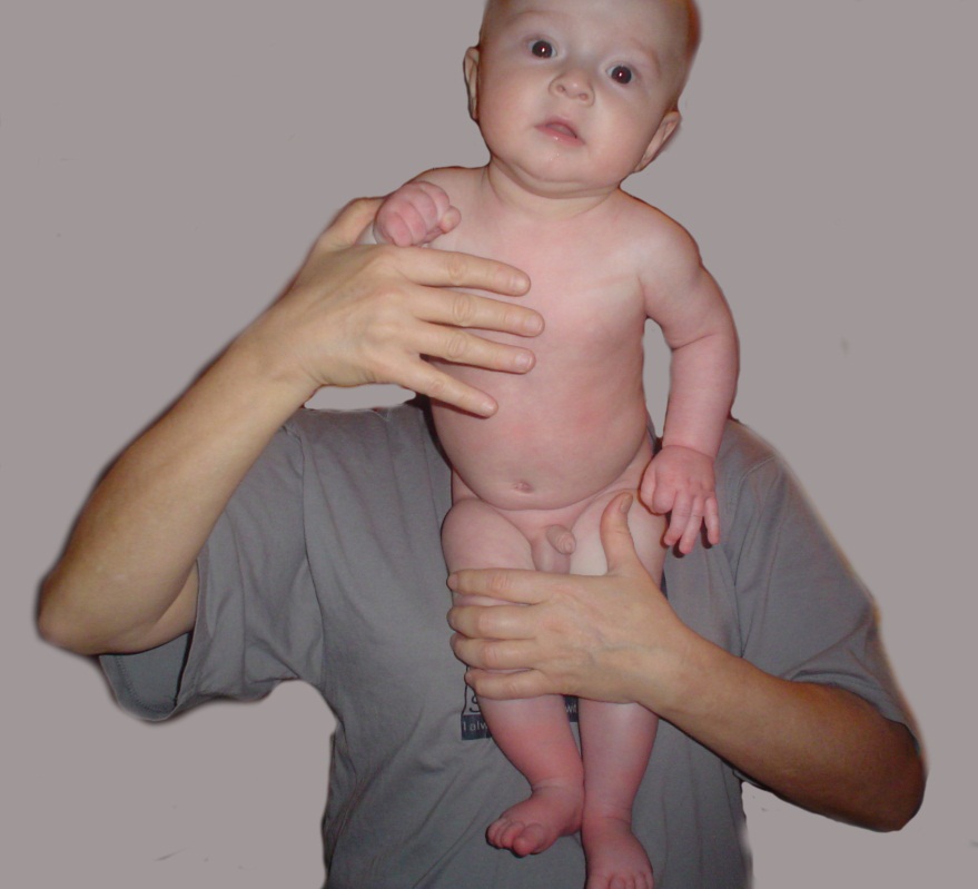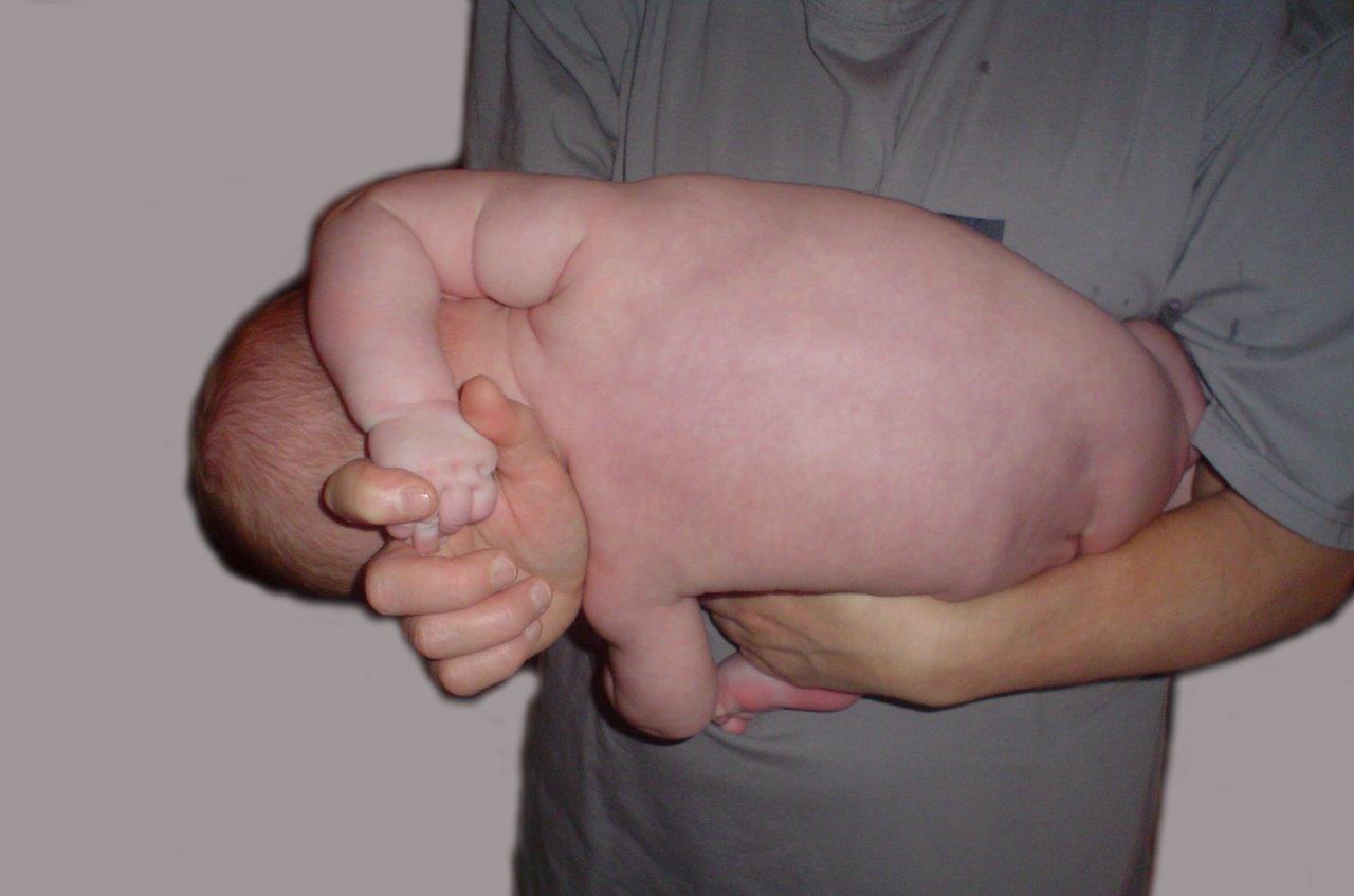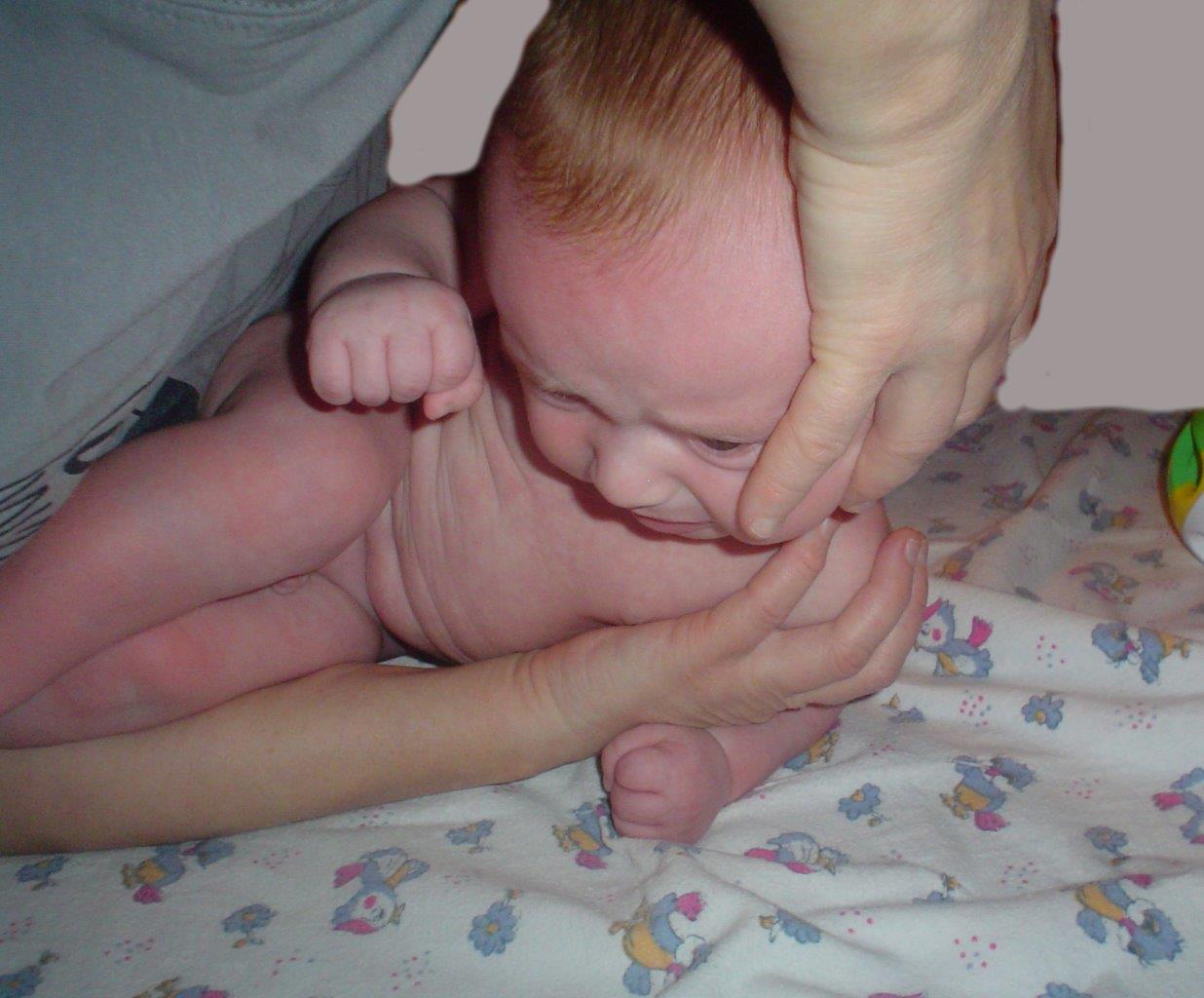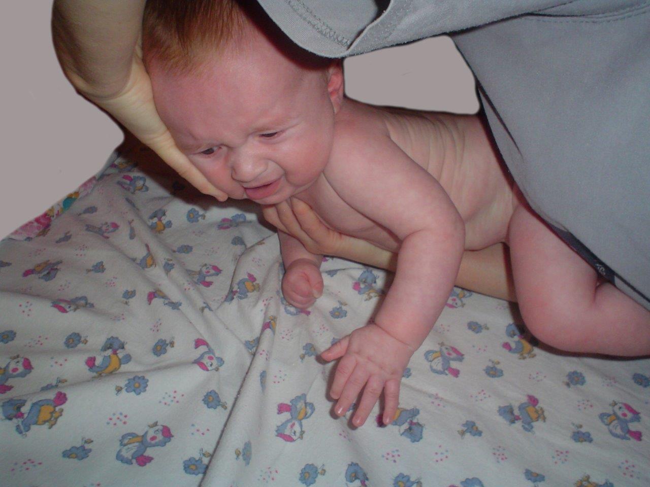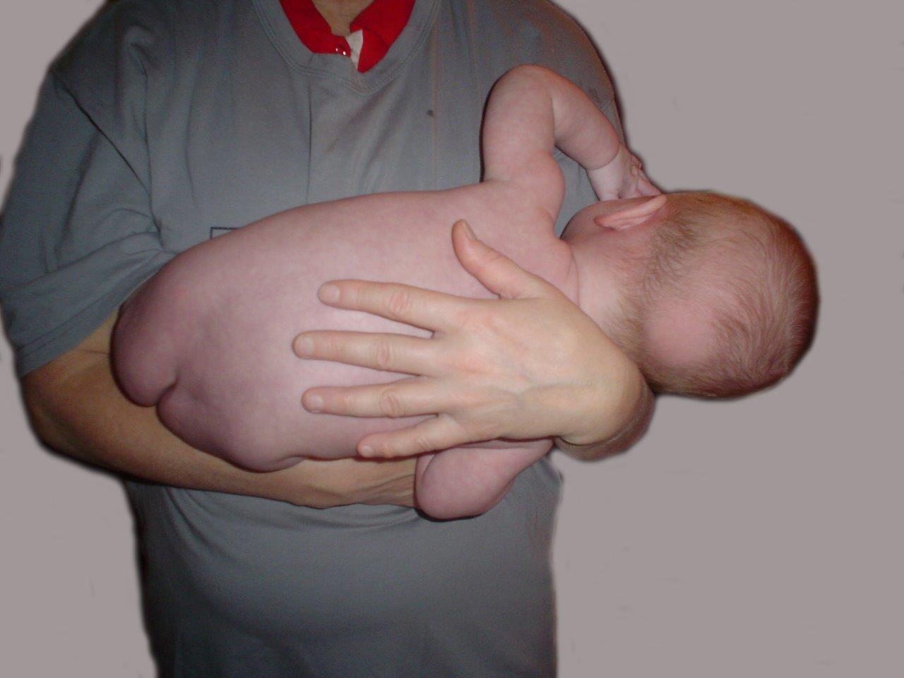 2.Возьмите ребенка спиной к себе, поддерживая под колени (3–5 сек). Колени старайтесь поднять на уровень лица ребенка. Делать несколько раз в день. Называется «Поза эмбриона» (фото 2).