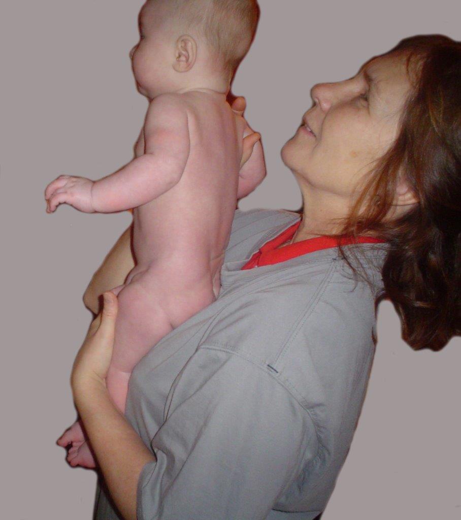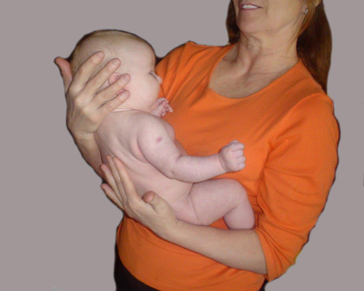 4. Правой рукой прижмите ребенка животом к себе, поддерживая его под ягодицы, ноги ребенка разведены в стороны. Левой рукой поддерживайте под спину и медленно, покачивая, наклоните ребенка в сторону. При этом его голова опускается на ваш левый локоть. Повторить упражнение с другой руки и в другую сторону. Важно несколько минут так подержать ребенка перед кормлением. Можно попробовать покормить его в этом положении (фото 4, 4а).