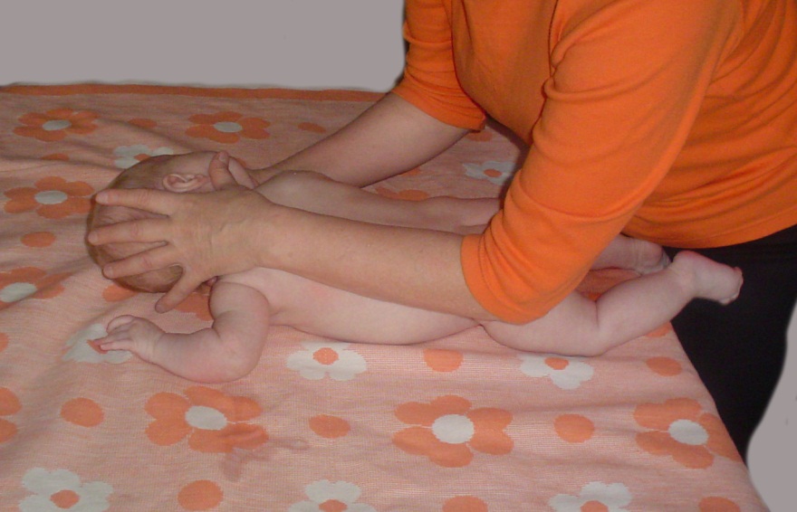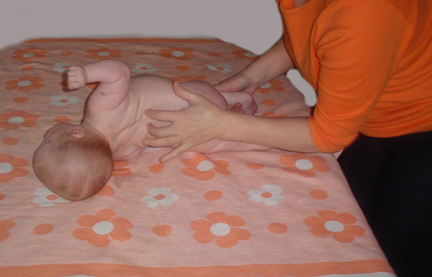 10. Повороты. Ребенок лежит на спине. Одной рукой колено ребенка прижимаем с противоположной стороны к столу, а двумя пальцами другой руки проводим вдоль позвоночника, не касаясь его, снизу вверх спиралевидными движениями. Ребенок, прогнувшись, поворачивается на живот (рефлекс Галанта), можно помочь ему повернуться. Прижимаем локти ребенка к телу и поддерживаем его голову так, чтобы его подбородок касался груди. Поворачиваем ребенка на спину, при этом голову опускаем на стол чуть позже, чем спину. Так ребенок привыкает беречь голову при падении. Нужно добиться, чтобы ребенок делал повороты одинаково легко в обе стороны (фото 10а, 10б, 10в).