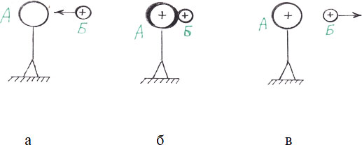 На рисунке 2а изображен металлический шар А (можно металлическую сферу) на токоизолирующей (не пропускающей электрические заряды) подставке. Вначале шар не имеет электрического заряда. К шару подносят заряженное положительно тело Б и касаются шара (рисунок 2б). Часть зарядов с тела Б «перетекает» на шар А и тем самым заряжают его тем же зарядом. В данном случае положительным. При удалении тела Б на значительное расстояние (чтобы не было существенного влияния его электрического поля на шар) электрический заряд шара сохраняется (рисунок 2в).