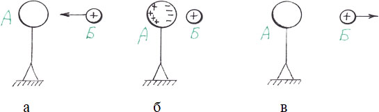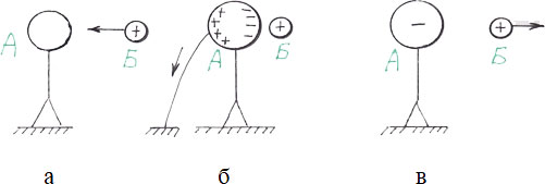 Если заряженное тело Б поднести к незаряженному шару А (рисунок 3а), то в последнем, на стороне, обращенной к заряженному телу, под действием электрического поля индуцируется (наводится) заряд противоположного знака (рисунок 3б). Более удаленная сторона этого тела будет заряжаться противоположным зарядом. Таким образом, одна часть тела заряжается, например, отрицательным зарядом, а другая – положительным. В целом, шар остается электрически нейтрален. Если убрать заряженное тело Б, то шар А опять станет незаряженным, то есть нейтральным (рисунок 3в).