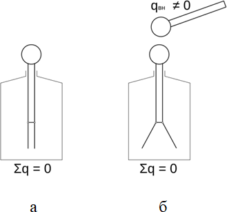 Если, не убирая первого заряженного тела подсоединить к одной из частей второго тела металлическую (токопроводящую) проволоку (рисунок 3в), соединенную с землей, то второе тело станет заряженным (рисунок 4б). Знак заряда будет противоположный тому, к какой части второго тела мы подсоединили проволоку (сделали заземление). Как представлено на рисунке 4б, токопроводящая проволока подсоединена к шару со стороны положительных зарядов. После отсоединения заземления отрицательный заряд распределиться равномерно по поверхности шара. Если подсоединили заземление к той части тела, которая была заряжена отрицательно, то тело зарядилось положительно. После этого первое тело можно убирать, а второе останется заряженным.