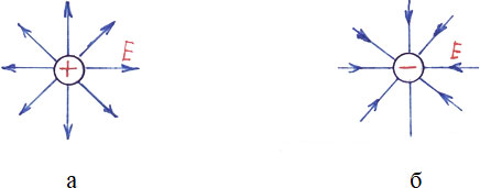 На рисунке 9 представлено графическое изображение электрического поля точечного заряда. Оно изображается силовыми линиями. Для положительного заряда это прямые линии, радиально расходящиеся из точечного заряда (рисунок 9а). Для отрицательного заряда электрическое поле графически изображается силовыми прямыми линиями входящие в заряд (рисунок 9б). Силовыми эти линии называются потому, что совпадают с направлением сил взаимодействия электрических зарядов между собой. (смотрите следующий параграф)