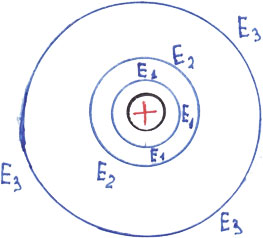 Закон Кулона определяет силу взаимодействия между двумя точечными электрическими зарядами. Сила взаимодействия пропорциональна произведению зарядов и обратно пропорциональна расстоянию между ними. Этот закон похож на закон всемирного тяготения: массы заменены на электрические заряды. Закон всемирного тяготения характеризует гравитационное поле, а электрические заряды описываются законом Кулона. Из этого закона можно определить напряженность электрического поля точечного заряда в любой точке пространства. Напряженность поля в какой-либо точке пространства пропорциональна величине заряда и обратно пропорциональна квадрату расстояния от заряда до данной точки. Напряженность поля уменьшается с увеличением квадрата расстояния. Например, с увеличением расстояния в три раза, напряженность поля уменьшается в девять раз. Поэтому все точки пространства равноудаленные от точечного заряда будут иметь одинаковую напряженность. В пространстве это будут концентрические сферы с центром в точечном заряда. На плоскости листа книги линии одинаковой напряженности представляют концентрические окружность с центром в заряде (рисунок 10). С увеличением расстояния напряженность будет уменьшаться. На рисунке 10 это уменьшение графически выражается уменьшением их плотности (расстояние между линиями электрического поля возрастает).
