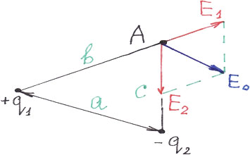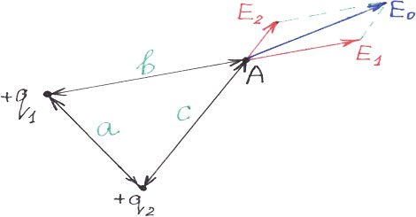 Рассмотрим для определенности два положительных электрических заряда q1 и q2 находящиеся на расстоянии а между собой (рисунок 11). Найдем напряженность электрического поля в точке А, расположенной на расстоянии b и с соответственно до первого и второго зарядах.