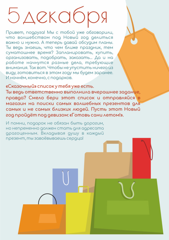 «Покупать подарки пятого декабря? Это что-то новенькое!» – подумала Маша. «Хотя… Ты прав. Я постоянно откладываю походы по магазинам, а потом покупаю не то что хочется, а то что успею. Или найду. Под Новый год люди звереют и сметают с полок всё!» – она приложила руку к подбородку и внимательно посмотрела на раскрытый календарь. «Ты, блин, гений!» – заключила девушка и начала собираться.