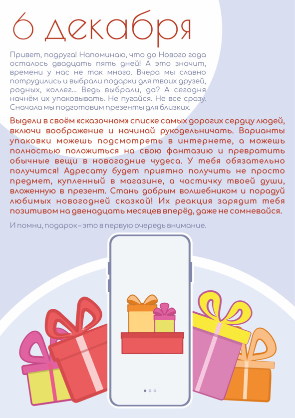 При виде искусно упакованных подарков с утра, Маша похвалила себя за старания. «Получилось идеально! Реально не понимаю, почему не делала так раньше…» – пробежало в голове. Взяв свой кофе, девушка уселась напротив календаря и с интересом перевернула страницу.