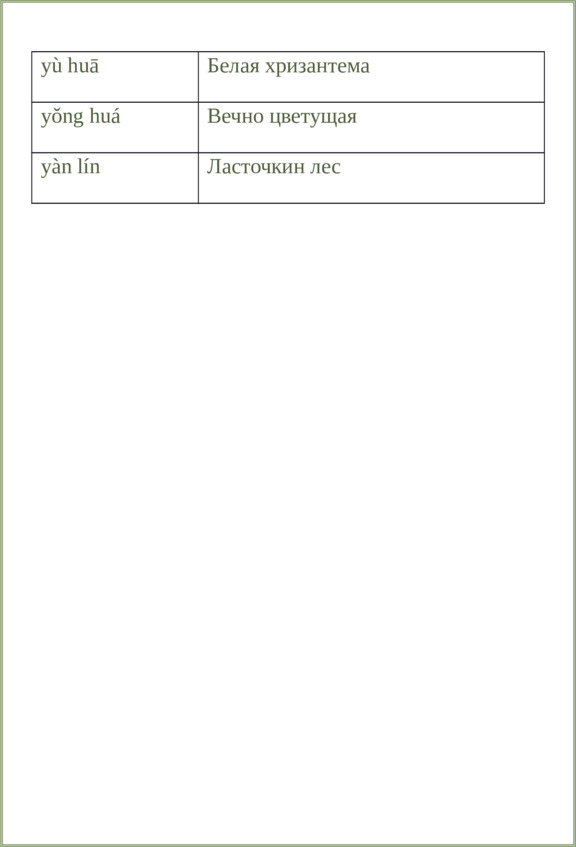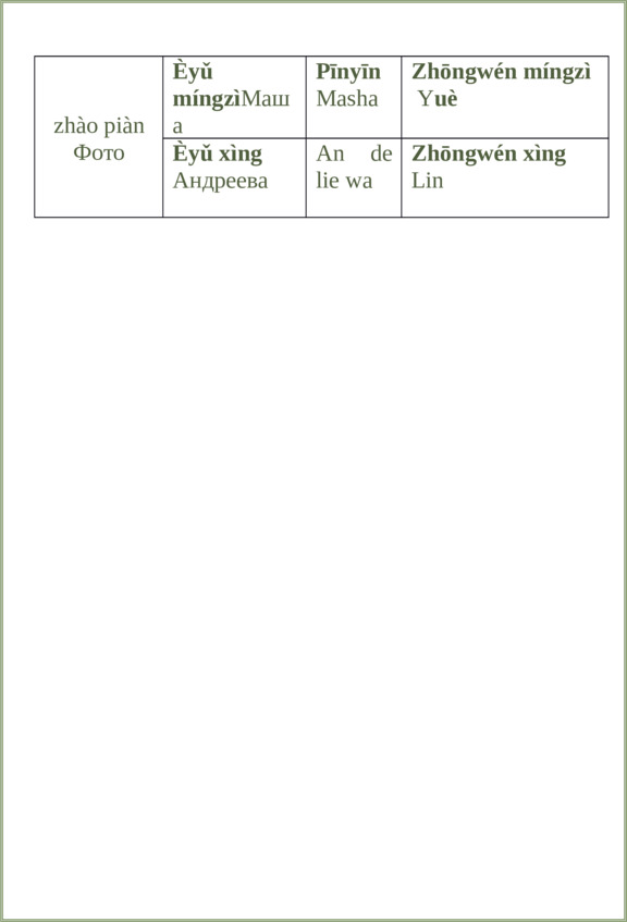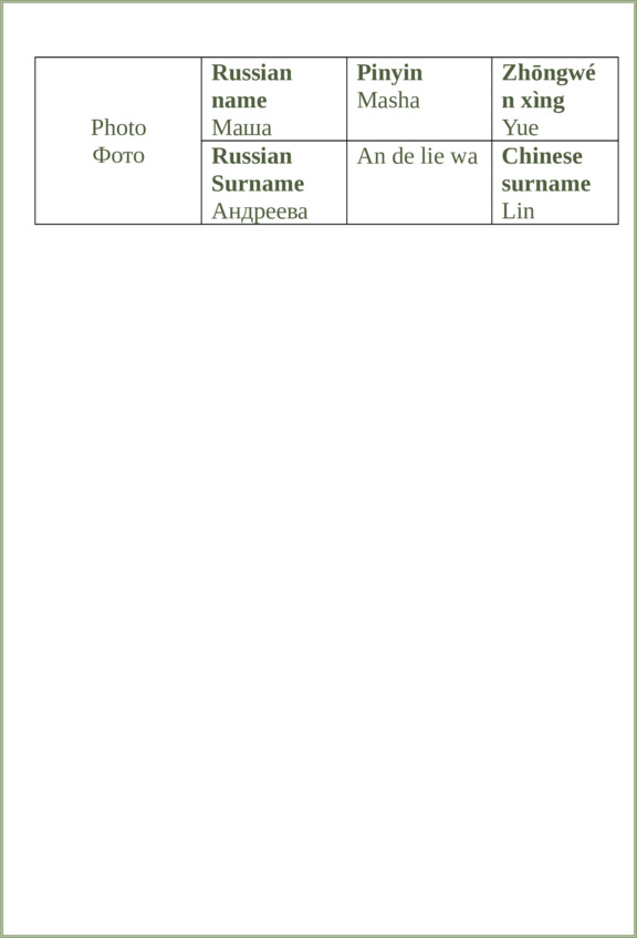 – «Визитка». Цель этого упражнения – Создание визитной карточки, на которой будет написано русское и китайское имя, а также русская и китайская фамилия. При желании ребенка, визитку можно украсить орнаментом и рисунком, особенно если имя ассоциируется с каким-либо предметом, цветком, животным. Детям особенно интересно выполнять визитку в цветном варианте, с использованием различных аппликаций. Например – золотой дракон, желтая хризантема, яшмовый лес и т. д. Если учитель хочет попросить детей сделать визитку с рисунками, то лучше сделать это домашним заданием. Так же можно устроить выставку или конкурс визиток.