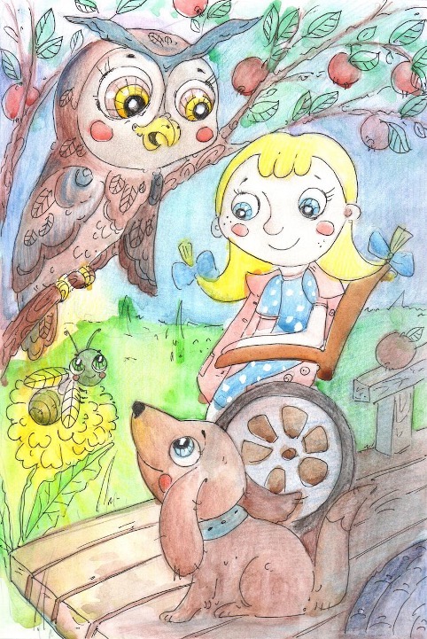 Светланка, Малыш, Соня и Серёжа направились в сад. Малыш бежал впереди. Сова Соня летела над головой девочки. А светлячок Серёжа освещал дорожку, по которой шли друзья.