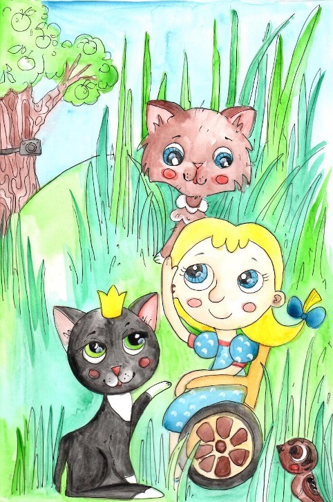 Девочка увидела, что она и её креслице на колёсиках уменьшились. Теперь Светланка и её любимая кошка Мурка стали одного роста.