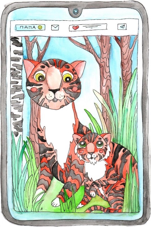 – Это амурский тигр. Мой папа сейчас работает в экс-пе-ди-ци-и. Он изучает амурских тигров. Недавно прислал мне фотографии. Вот посмотри.