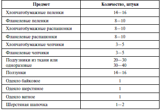 Желательно, чтобы кровать была изготовлена из натуральных материалов, например из дерева. Ширина кровати должна составлять 60–70 см, а длина – около 0,8–1 м. Ножки кровати должны быть высокими, боковые стенки должны иметь перекладины, одна из стенок должна опускаться. В кровать следует положить матрац (ватный или волосяной). Матрац можно сделать и самостоятельно: сложить в несколько слоев старое одеяло и простегать его. Он не должен быть слишком мягким, так как это может привести к деформации скелета новорожденного. На матрац можно постелить резиновую клеенку, чтобы не испачкать матрас в то время, когда ребенок мочится. Мыть клеенки нужно ежедневно, поэтому лучше приобрести их сразу несколько. Сверху клеенки обязательно кладут сложенную в несколько раз хлопчатобумажную пеленку, которая предохраняет ребенка от потения. Подкладывать подушку новорожденному не следует, поэтому будет удобно, если головной конец кровати будет приподниматься. Также будет удобно, если кровать будет иметь колесики: ее можно будет легко передвигать для более тщательной уборки помещения или во время проветривания комнаты. Место, где будет располагаться кровать, должно быть хорошо освещенным, сухим, защищенным от сквозняков, температура – от +22 °C до +24 °C для доношенных детей и от +24 °C до +26 °C для недоношенных. Желательно, чтобы не было перепада температур между спальней ребенка и остальными помещениями в доме. Кровать лучше ставить недалеко от окна, но вдали от нагревательных приборов. Во время сна ребенка необходимо защищать от прямых солнечных лучей (для этого используются занавески). Для прогулок с ребенком потребуется коляска, желательно обтянутая кожей, так как это несинтетический материал и легко моется. Лучше, чтобы кузов коляски был жестким, так как он надежнее защищает ребенка от внешних воздействий. Диаметр колес коляски различен: чем он больше, тем легче коляска преодолевает неровности дороги; чем ширина колеса уже, тем хуже сопротивление качению. Накачиваемые шины и амортизирующая подвеска уменьшают воздействие на ребенка со стороны дороги. Для пеленания удобнее всего использовать специально сделанный для этого столик, однако возможно пеленать ребенка и в его собственной кровати. Ни в коем случае нельзя класть ребенка на свою собственную кровать или на стол, не покрытый детской простыней. Для пеленания ребенка необходим следующий минимум (см. табл. 9).