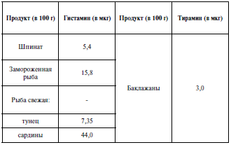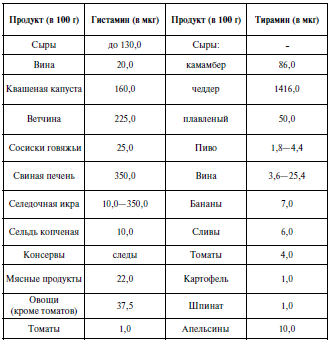 Таблица 9. Содержание гистамина и тирамина в пищевых продуктах