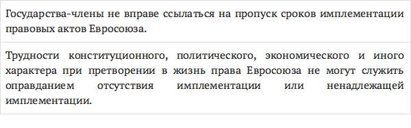 Помимо этого, Суд ЕС формулирует общие запреты, подлежащие соблюдению в процессе имплементации, в том числе следующие.