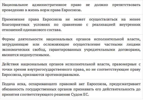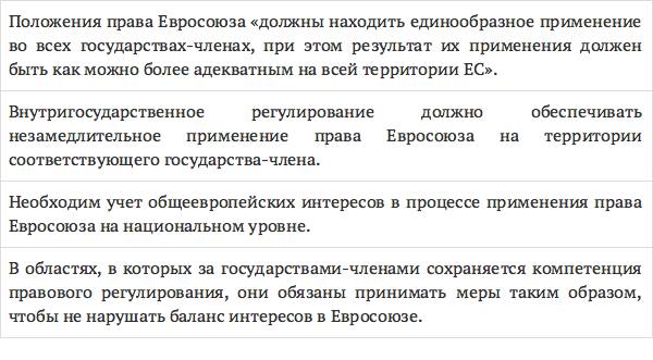 В остальных случаях, т. е. когда право Евросоюза не предусматривает единых предписаний, государственные органы в процессе применения интеграционного права действуют на основе национального права. В этой связи Суд ЕС счел необходимым установить ряд требований к деятельности национальных органов исполнительной власти.