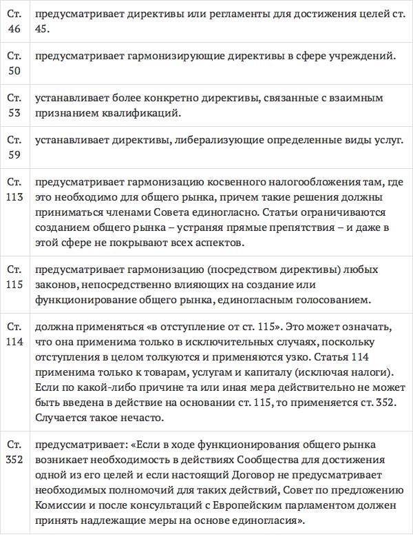 Последствия гармонизации. Гармонизирующие меры, принятые на основании положений ст. 115 Договора о функционировании Европейского союза и по многим другим основаниям, имеют форму директив. Меры же, принятые на основании положений ст. 114 Договора о функционировании Европейского союза и некоторых других, могут быть либо директивами, либо регламентами. Регламенты становятся законом прямого действия во всех государствах-членах на 20-й день после их опубликования либо со дня, указанного в регламенте.