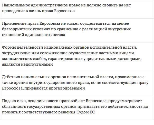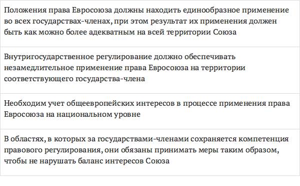– трудности конституционного, политического, экономического и иного характера при претворении в жизнь права Евросоюза не могут служить оправданием отсутствия или ненадлежащей имплементации.