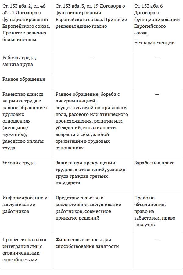 Основой перечня правовой компетенции является ст. 153 Договора о функционировании Европейского Союза. В абз. 1 данной статьи указывается, что Союз поддерживает и дополняет действия государств-членов в области социальной политики. Но речь идет не об исключительной компетенции Союза: все регулирование Союза придерживается принципа субсидиарности (абз. 2 ст. 5 Договора о Европейском союзе (Лиссаб. ред.)). Согласно ст. 5 государствам-членам остается возможность для учета особого положения малых и средних предприятий издавать для них более благоприятные нормы (ограничение минимальной гармонизации). Статья 153 Договора о функционировании Европейского союза не отходит от принципа большинства и оставляет определенные области в полной компетенции государств-членов. Абзац 1 ст. 46 и ст. 19 Договора о функционировании Европейского союза не ограничиваются принципом минимальной гармонизации. В целом существует ступенчатая интеграционная программа. Ступенчатая программа интеграции социальной политики (ст. 153, 157, 46, 19 Договора о функционировании Европейского союза) представлена в следующей таблице.