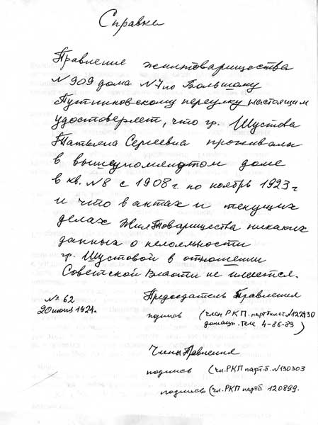 Шуня поступила в Московский университет, но через год вынуждена была уйти – надо было зарабатывать. Отец, Сергей Николаевич, оставался работать на бывшем «своем» заводе в Москве, так как рабочие завода вошли с ходатайством к Ленину, и его не тронули, оставив директором завода. До 1933 года, когда дедушка скончался, мама ходила к нему на работу брать справку, что он не «лишенец», потому что с фамилией «Шустова» жить было достаточно сложно.