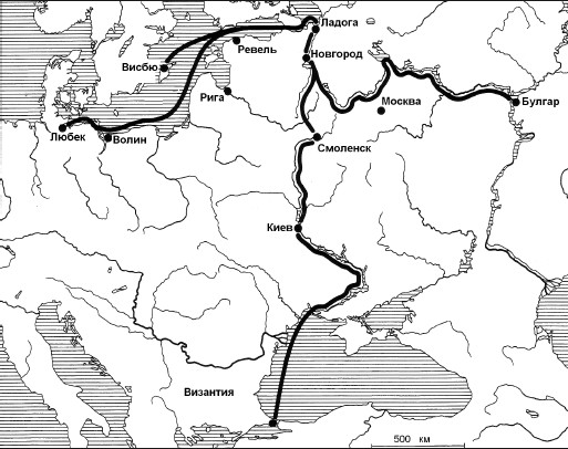 Балтийско-днепровская и балтийско-волжская водные магистрали стали теми путями, по которым в IX в. двигались скандинавы, осваивая новые территории для торговли. Еще до образования собственно Новгорода в истоке Волхова, на его правом берегу, в IX в. существовало торгово-ремесленное поселение, контролировавшее путь «из варяг в греки», известное в источниках под названием Городище. Именно здесь поселился со своей дружиной варяжский князь Рюрик, призванный в 859 г. местными племенами. С тех пор Городище стало местопребыванием князя (княжеской резиденцией) в течение нескольких столетий. Оно и было предшественником Новгорода, то есть Нового города, в этом регионе.