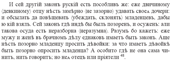 Нынче свататься не ходят,Набиваться не пойдут,Наши старые родителиПриданого не дадут.[78]Обычай навязывать невесту зафиксирован уже в 1663 г. в «Русском законе» автора «Записки Юрия Крижанича о миссии в Москву 1641 г.», который два раза был в России и провел около 15 лет в качестве ссыльного в Тобольске:[79]