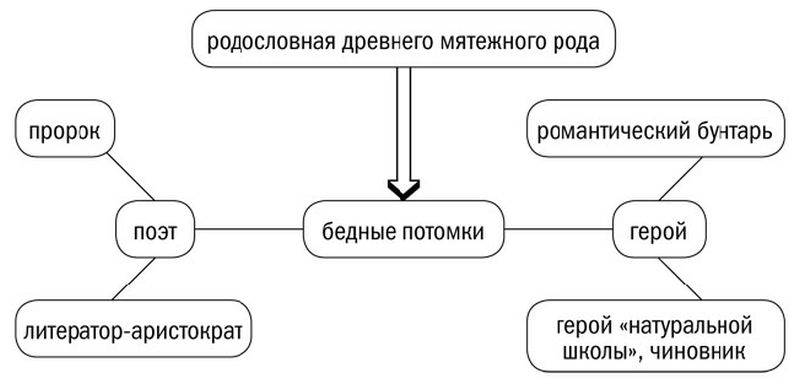 IV. Тень поэтаТо, что Кумир – тень Петра, ясно из самого текста поэмы. А присутствие тени поэта в Евгении удостоверяют черновые редакции и близко связанные с МВ замыслы: «Езерский», «Родословная моего героя», «Моя родословная», импровизация из «Египетских ночей» («Поэт идет. Открыты вежды…»). Видно, как по ходу работы и сужения замысла герой удаляется от автора, как удаляется сам автор от текста (уничтожение лирических отступлений – о судьбе дворянства, о свободе вдохновения). Ядром расходящихся замыслов, кажется, можно считать «судьбу потомка мятежного рода», получающую и автобиографический, и персонажный оборот: ср. «С Петром мой пращур не поладил» («Моя родословная»); «При императоре Петре…» (обрыв родословной в «Езерском» и «Родословной моего героя»); «Люблю встречать их имена в двух-трех строках Карамзина» («Езерский»); «И под пером Карамзина в родных преданьях прозвучало» (МВ). Можно предложить такую схему разветвления замысла: