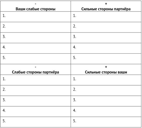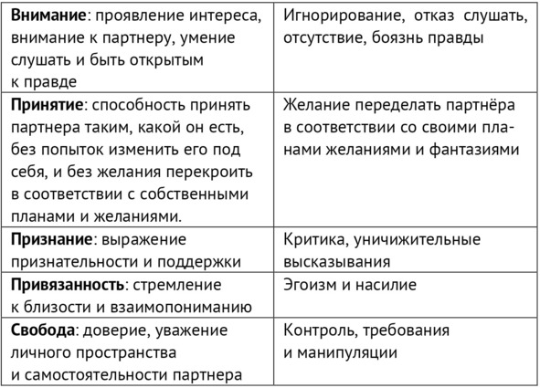 Посмотрите на приведённую таблицу и выявите те установки, которые сейчас проявляются в ваших отношениях с партнёром. Поговорите с партнёром о том, что каждый готов сделать ради другого и ваших отношений.