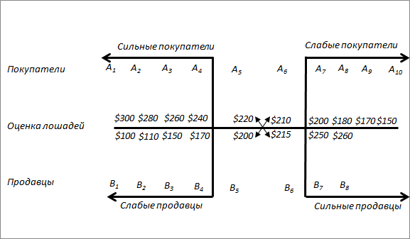 По мере того, как цена поднимается выше $150, тем не менее, рынок лошадей начинает приходить в равновесие. Слабые покупатели – те, чья субъективная оценка стоимости самая низкая – устраняются с рынка, и, по мере того, как растёт цена, прибавляется продавцов. Например, при цене $210, четверо покупателей устраняются с торгов (покупатели от А7 до А10) и только пять продавцов включены в них. Но очистится ли рынок при цене $210? Ясно, что нет, потому что, при цене $210, шесть покупателей (от А1 до А6), но только пять продавцов (от В1 до В5) пожелают участововать в торговле.