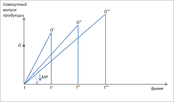 «Непрямота производства» увеличивается с t до t', и т. д., совокупный объём выпускаемой продукции также увеличивается, но с понижающимися темпами. Наклон полупрямой tQ' является маргинальным продуктом капитала в течение периода tt'