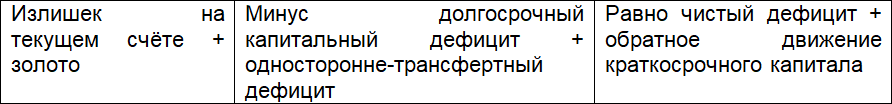 Так как бухгалтерия двойная, баланс платежей всегда уравновешивает приход и расход средств, и поэтому концепции «дефицита» или «излишка» необходимо выводить из организации и значений определённых счетов. Некоторые счета, обозначенные выше буквой А, считаются автономными или возникшими как ответ на силы рынка, а другие, обозначенные буквой К, считаются компенсирующими. Считается, что долгосрочные капитальные позиции и торговля реальными товарами, например, мотивированы фундаментальными экономическими силами, разницами процентных ставок, различиями в относительных ценах на отечественные и зарубежные товары, и тому подобным. Такие движения рассматриваются как автономные. Другие являются компенсирующими счетами и отражают результаты автономной торговли и денежных потоков. Таким образом, золото Соединённых Штатов, экспортированное во Францию, или увеличившиеся американские долларовые холдинги в центральном банке Франции, будут компенсацией, выплаченной Соединёнными штатами Франции за торговый дефицит или за чистый дефицит в долгосрочной капитальной позиции между Соединёнными Штатами и Францией. Можно описать дефицит между страной-кредитором и остальным миром следующим образом: