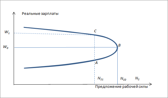 По мере того, как заработные платы увеличиваются с w0 до w1, происходит уменьшение предложения труда с NS0 до NS1.