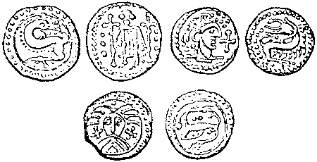 Сам по себе факт использования в монетном чекане знаков, связанных с более ранними верованиями или изобразительными сюжетами предшествующего периода, не является чем-то особенным. В ранних чеканах германских народов (например, у вандалов) монетные типы, обычно подражающие Риму (погрудное изображение правителя в венке, Виктория, держащая корону, и т. д.), на оборотной стороне могут нести изображение головы лошади. На ранних англосаксонских монетах помещен дракон или змея, что объясняется влиянием местных древних верований, в которых германский бог, чудовищный Вотан (Водан – Один), носитель магической силы, играл важную роль[46].