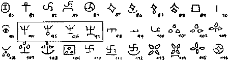 Исследование знаков собственности Монголии[49] позволило его автору выделить две группы подобных знаков: «простые» знаки-начертания и тамги, имеющие магический смысл. Автор выделяет особую тамгу, которая обозначает трон, место правителя, алтарь и имеет специфическое название. В письменных текстах (с включением названия данной тамги) отмечается, что речь идет о «ханах на троне, правителях, которые занимают престол». Исследователь подчеркивает, что имеются основания относить тамгу с подобным названием к привилегиям господствующих семей[50]. Графически словесному выражению, включающему обозначение данной тамги, соответствует трезубец в разных вариантах (см. рис. 3, № 94–97).