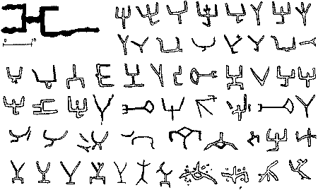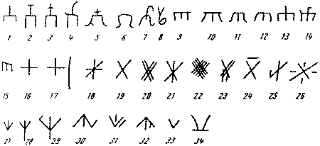 Второе замечание Рыбакова относится к боспорским царским знакам, также тамгообразным. Верхние части некоторых из этих знаков напоминают человека с поднятыми вверх руками или головы рогатых животных. «Может быть, – пишет ученый, – при дальнейшей разработке этой гипотезы и удастся указать прототип для этих знаков, схематизированное изображение какой-нибудь ритуальной сцены с непременным участием коней, сцены, напоминающей известные дакосарматские элементы в русском народном творчестве»[29].