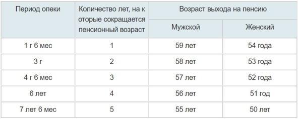 Для опекунов расчет возраста для выхода на пенсию происходит на других условиях. Пенсионный возраст уменьшается на 1 год за 1,5 года опеки.