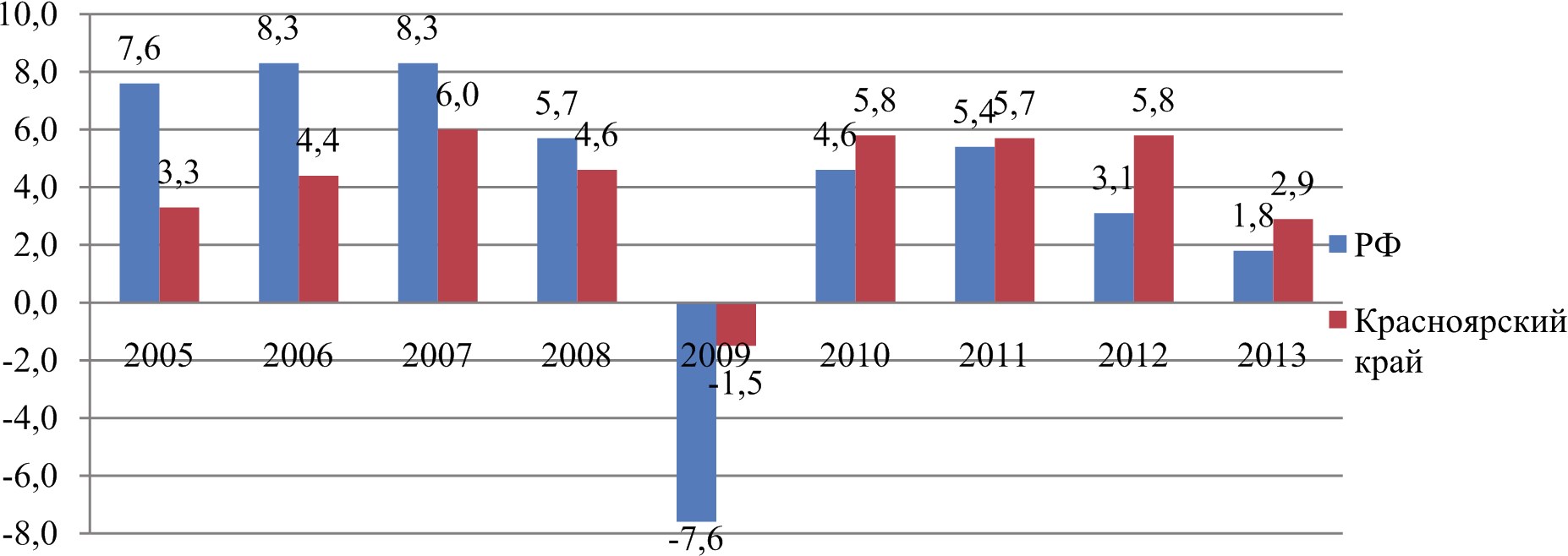 Рост валового регионального продукта (ВРП) Красноярского края в посткризисный период 2010–2013 гг. превысил средний по России. В 2012 г. темп прироста ВРП территории достиг 6 %, что на 3 % выше общероссийского уровня, однако в 2013 г. темпы прироста ВРП упали и составили 1,8 % и 2,9 % для России и края соответственно (рис. 5).