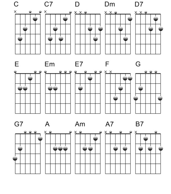 А-ля мажорАм- ля минорB (H) -си мажорB (H) м- си минорС-до мажорСм- до минорD- ре мажорDm- ре минорE-ми мажорEm-ми минорF-фа мажорFm-фа минорG-соль мажорG7- доминант септаккорд от сольGm-соль минор