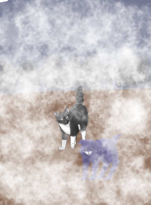 Слякоть неприятно булькала под лапами, пачкая лапы двух иных кошек. Туман становился все гуще и гуще, и уже не был похож уже на безобидное облачко, а скорее становился белой дымовой завесой. Маленькие капельки дождя капали на кошек и барабанили по асфальту. Их окружали самые разные деревья: от дубов до маленьких березок, а ветер начинал становится сильнее и сильнее, развивая с бешеной скоростью шерсть кошечек.