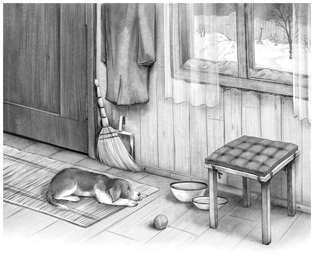 Щенок чувствовал себя, словно листочек с дерева, который оторвался от ветки и попал в неведомый мир. А за окном лишь кружились крупные хлопья снега и медленно опускались на землю. Позже щенок не подошёл даже к миске, в которую Николай заботливо положил куриные консервы, а продолжал неподвижно лежать.