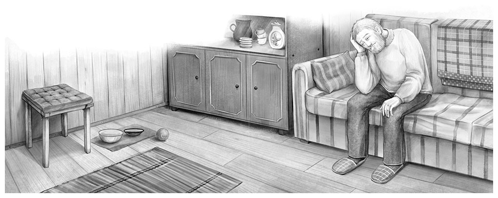 Кряхтя, он приподнялся на диване, всунул ноги в стоптанные тапочки и пошёл к двери, держась за стенку. Голова всё ещё кружилась, а перед глазами расплывалась пелена.