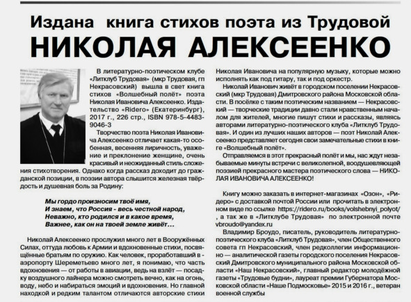 Николай Иванович живёт в городском поселении Некрасовский (мкр Трудовая) Дмитровского городского округа Московской области. В посёлке с таким поэтическим названием – Некрасовский – творческие традиции давно стали нравственным началом для жителей, многие пишут стихи и рассказы, являясь авторами литературно-поэтического клуба «Литклуб Трудовая». И один из лучших наших авторов – поэт Николай Алексеенко представляет сегодня свои замечательные стихи в книге «В моём Подмосковье», с которым у автора связана практически вся жизнь – воинская служба, работа в аэропорту Шереметьево, семья, творчество.
